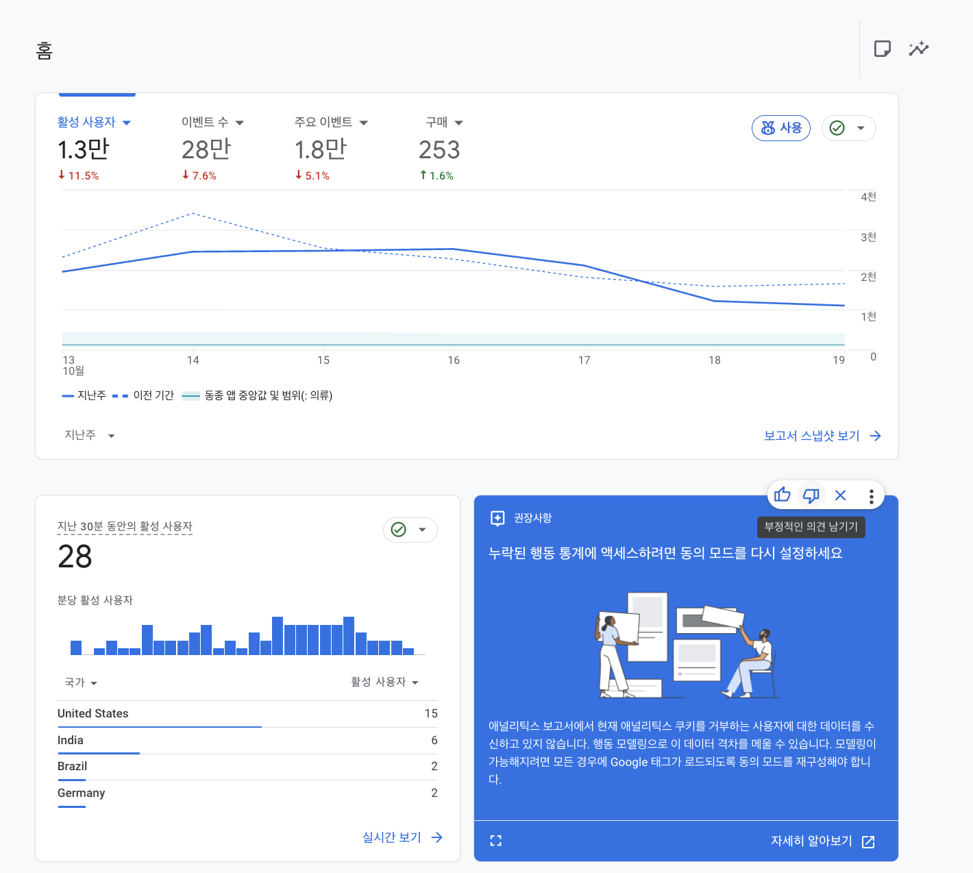 → 최근 일주일동안 28만 번의 행동 ( 클릭,조회,구매 ) 등이 일어났으며 지난주보다 약 7.6% 감소한 것을 알 수 있습니다.